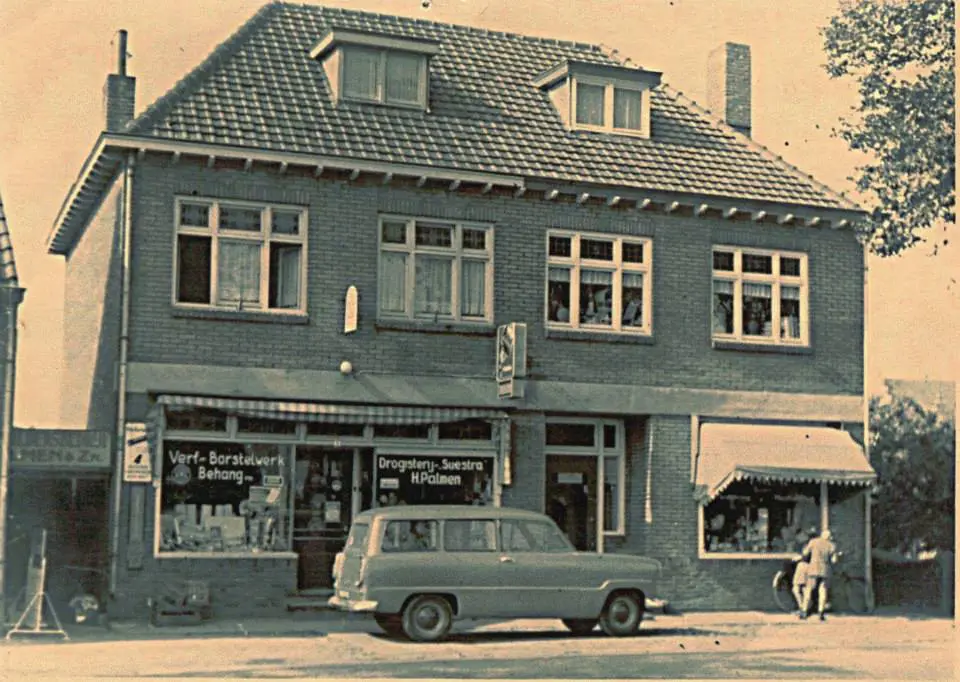 Destijds, jaren ’60 twee winkels naast elkaar. Links de drogisterij, verf en behangbedrijf van Baer Palmen met daarnaast de winkel van een oom van Baer, ook wel poppepalm genaamd, waarschijnlijn vanwege speelgoed en poppen die hij verkocht. Later werd het één winkel in verf en verfbenodigdheden en een stuk woninginrichting.