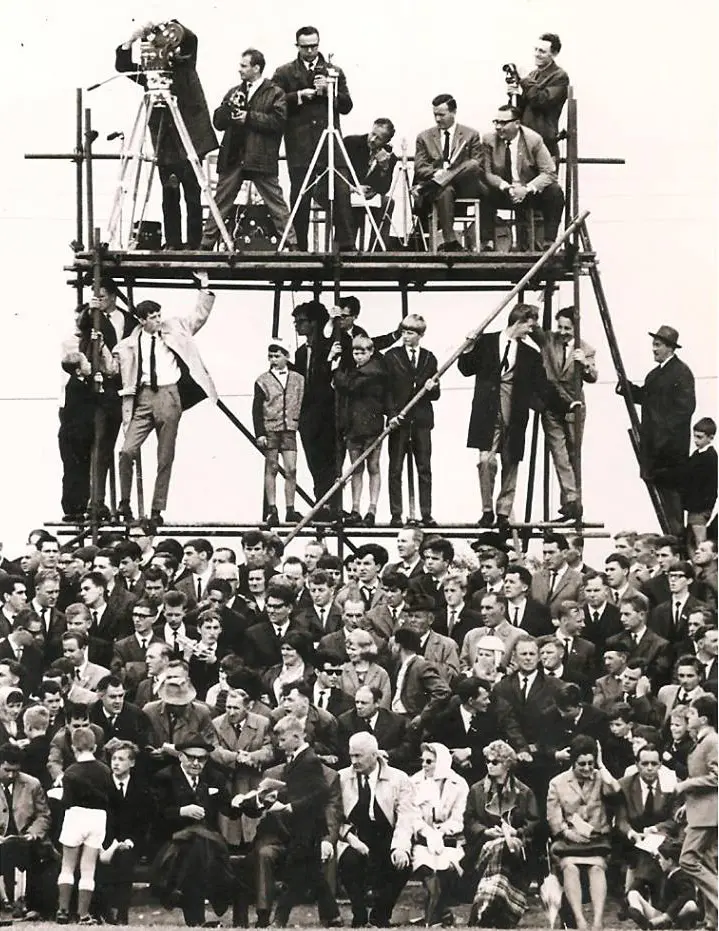 De “perstribune” in 1965, TV opnamen voor Sport in Beeld (nu Studio Sport) vrnl op de 2e etage de 2e persoon zittend was de bekende sportverslaggever destijds Koen Verhoeff.
