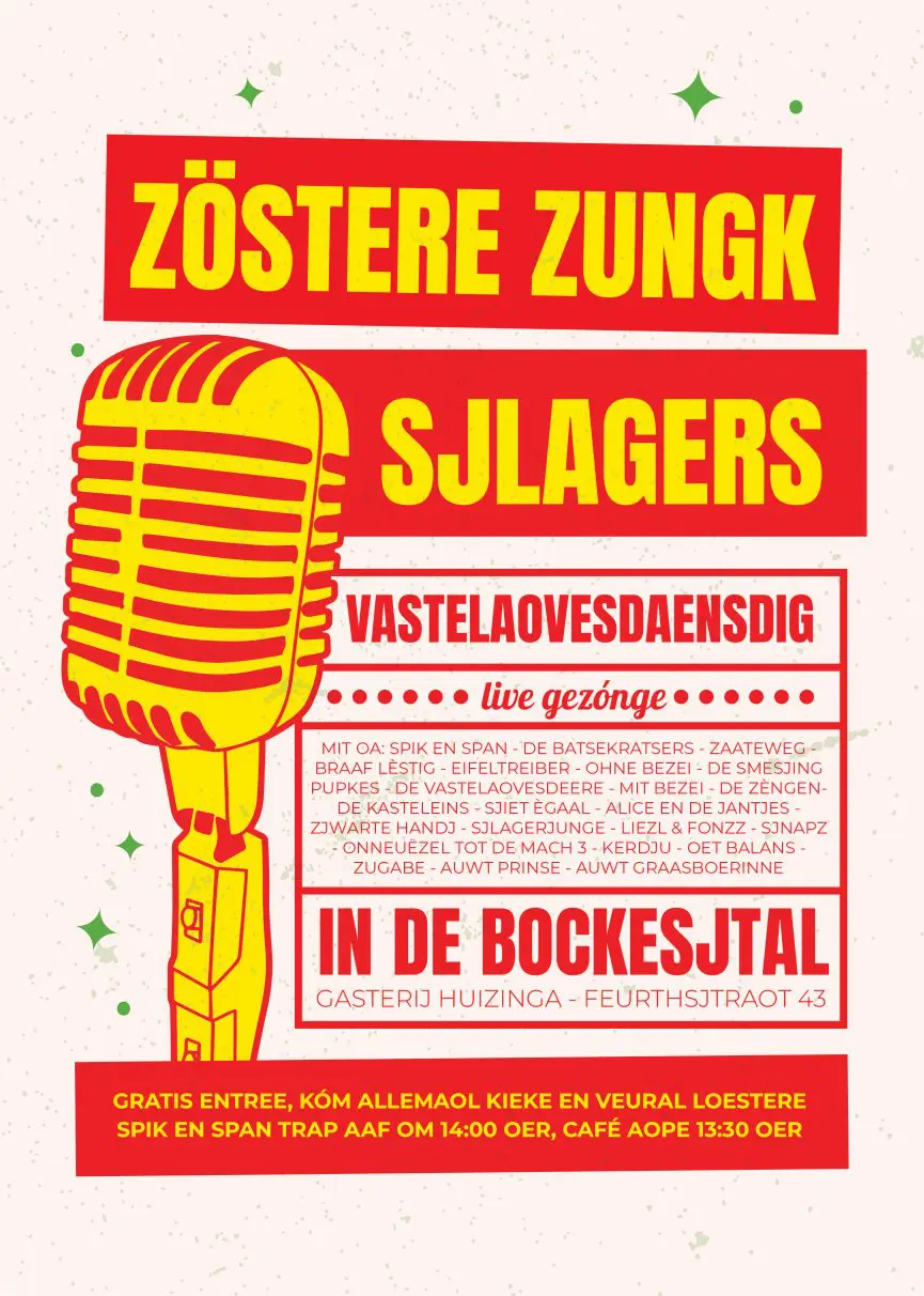 Op carnavalsdinsdag 4 maart zal “De Bockesjtal”, Gasterij Huizinga, Feurthstraat 43 Susteren, het toneel zijn van een bijzondere muzikale reünie: Zöstere Zungk Sjlagers. Tijdens dit unieke evenement beleven oude “Zösterse Sjlagers” een ware opleving, live vertolkt door de oorspronkelijke artiesten. Meer dan twintig oud-deelnemers van … Lees meer
